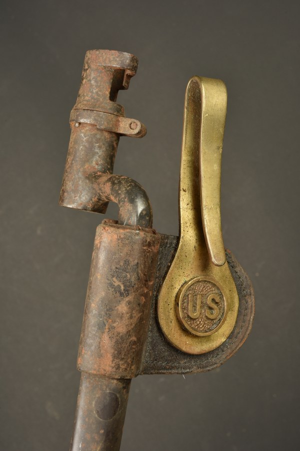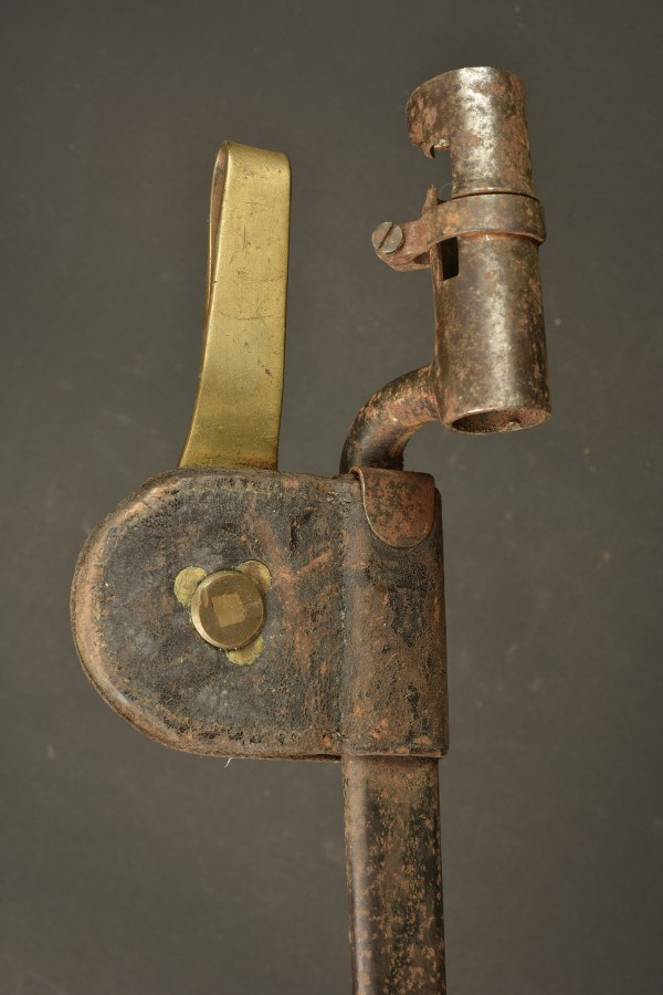 Baïonnette à douille US M1873. Baïonnette à douille pour le fusil Springfield M1873 Trapdoor, lame triangulaire, marquée US. Avec fourreau fer et porte fourreau du 1er type avec macaron laiton marqué US et crochet laiton. oxydation. II