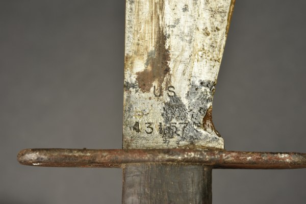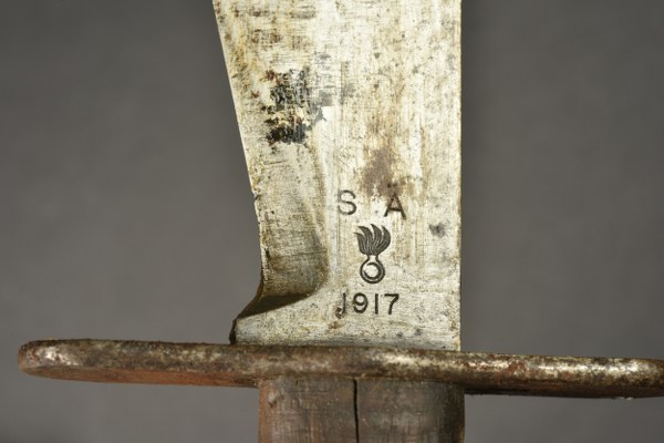 Couteau Bolo US 1917. Poignée en bois maintenue par deux rivets. Lame avec corrosion. Fabrication S.A. Springfield Armory daté 1917. Fourreau recouvert de toile kaki. Crochet de fixation au ceinturon présent. Renfort de fourreau en cuir marqué Brauer Bros 1917, et lettres DM. Bon état II
