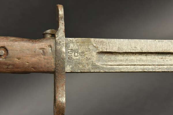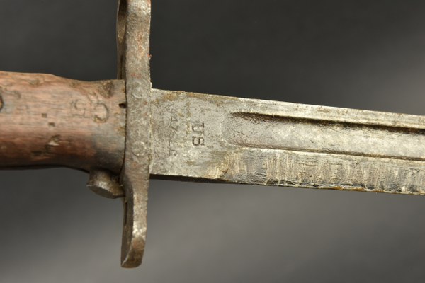 Lot baïonnettes et équipement US 1917. composé d'une baïonnette Springfield en mauvais état, avec fourreau sans toile et peau endommagée, une autre en mauvais état sans fourreau, une gamelle datée 1918 et une housse de culasse en toile marron possiblement de fabrication française. II