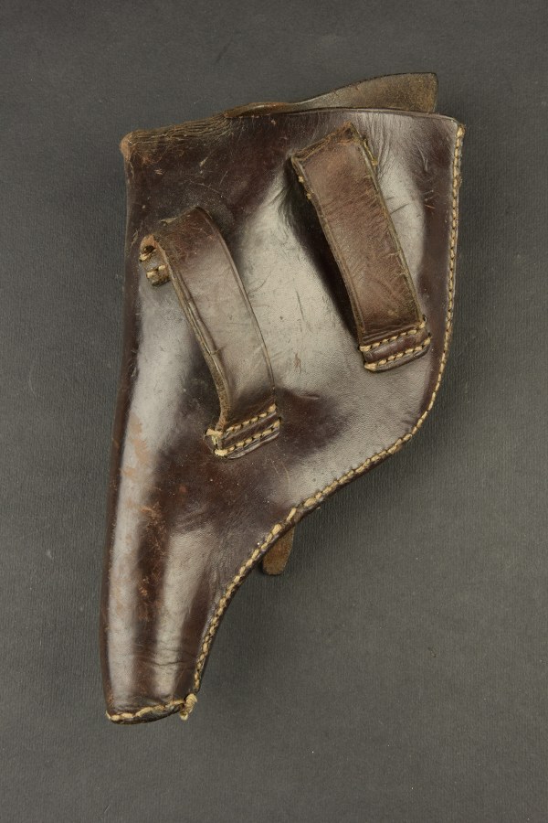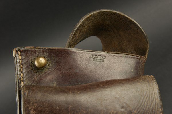 Etui cuir pour Reichsrevolver M1883. Bel étui en cuir marron, marqué du fabricant F. COBAU de BERLIN. Têton de fermeture laiton, poche à cartouche, boucle à ardillon nickelée. Bon état II+