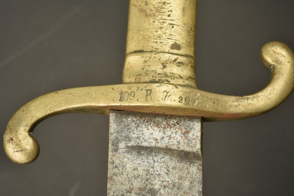 Baîonnette Ersatz et Glaive M1864 du 109e Badois. Baïonnette ersatz en fer, poignée moulée avec son fourreau. Un Faschinenmesser M1864 régimenté 109R, sans fourreau. Corrosion, usure. II