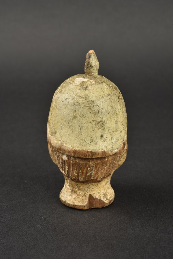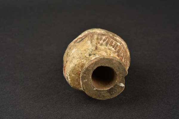 Tête de marionnette avec casque à pointe. Belle et peu courante tête de marionnette figurant un soldat allemand de la 1ère guerre, en bois polychrome, casque à pointe recouvert d'un couvre casque vert avec chiffre 32 en rouge. Usure d'usage, patine. II