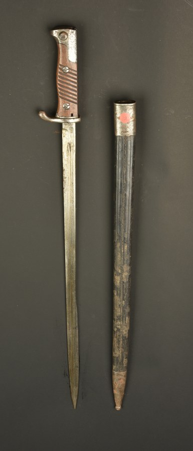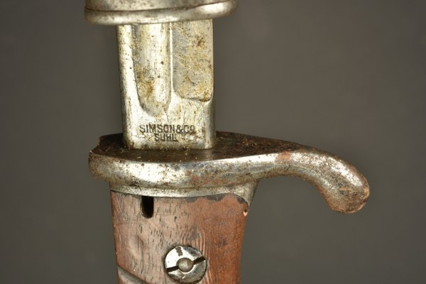 Baïonnette allemande S98. Du 2nd type, neuer Art. Lame du fabricant Simson & Co datée 1907. Plaquettes bois, poussoir fonctionnel. Fourreau cuir et fer. Oxydation superficielle, légère usure, patine. II