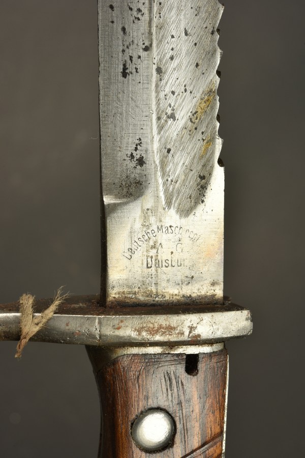 Baïonnette 98-05 dents de scie. Lame aiguisée et nettoyée. Fabricant Deutsche Maschinenfabrik, date illisible sur le dos. Fourreau fer. Porte fourreau cuir avec marquage O.Z.M.W. 1922. décousu sur un des côté de la gaine de fourreau. Usure, patine II