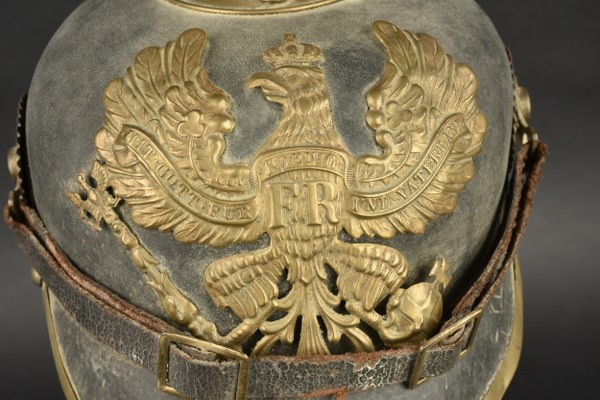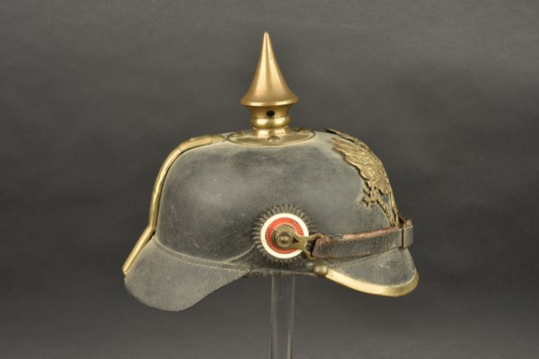 Casque à pointe prussien M1895 troupe. Bombe en fibre, visière et nuquière en cuir, nom manuscrit sur la nuquière. Coiffe à dents de loup en cuir noir. Toutes garnitures en laiton. Plaque à l'aigle prussien, pontets soudés d'origine. Bonnes cocardes, jugulaire sans garantie mais bel aspect, fragile. II