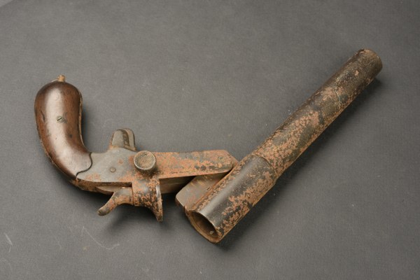 Pistolet lance fusée allemand Druckknopf de la 1e Guerre. En métal bronzé, oxydation sur la quasi-totalité des parties métalliques, à nettoyer. Plaquettes bois. Anneau de grenadière présent. Fabricant JK, numéro de série 2745. Mécanisme fonctionnel, un peu grippé. II-