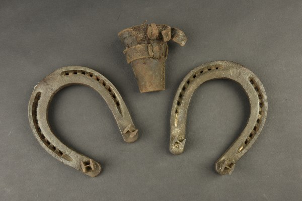 Sabot de lance de cavalerie allemand de la 1ère guerre. En cuir, de forme tronconique, sangles de fixation à l'étrier coupées. On y joint une paire de fer à chevaux avec crampons. Usure, patine II