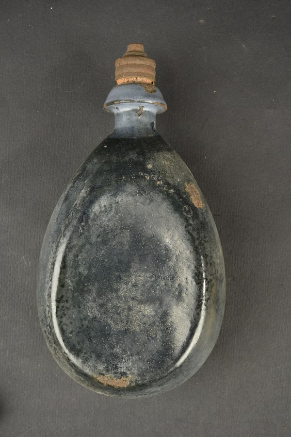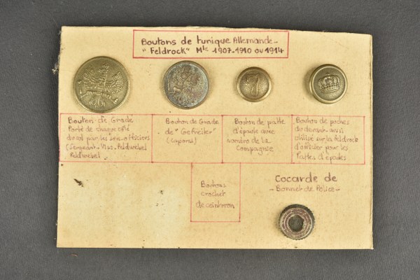 Lot d'objets du soldat allemand 1ère guerre. Comprenant un bidon émaillé, une boucle de ceinturon prussienne M1895 en bon état, une pierre à rasoir dans sa boîte, celle-ci déchirée, une fourchette avec une croix de fer stylisée, un paquet de tabac, une plaque d'identité d'un Pionnier, des boutons, et une plaque provisoire. Usure, patine II