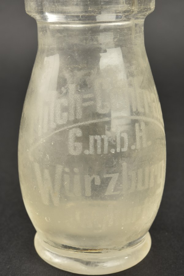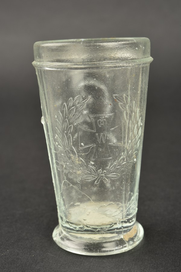 Lot de 3 verreries allemandes. Un verre Hindenburg et Croix de Fer, Un croix de fer et Gott mit Uns. On joint un pot Milch Centrale Gmbh Würzburg Joghurt à dater. Bon état. II