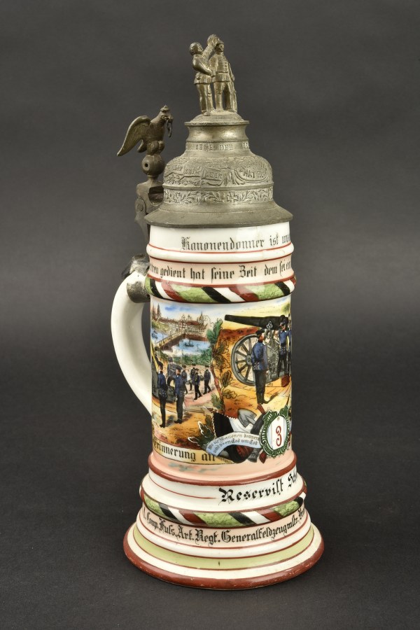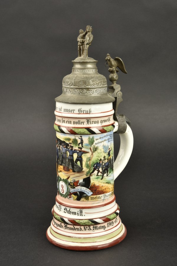 Chope de réserviste du 3e régiment d'artillerie à pied et pipe de Jäger zu Pferde. Chope en porcelaine blanche sérigraphiée et rehaussée à la main. En bon état, une fêlure au col. Marquée du Fuss Artillerie Regimlent Nr 3 de Mainz et datée 1905-1907. Le couvercle est d'époque mais la bague de maintien autour de l'anse est coupée. Accompagnée d'un fourneau de pipe à motif de Jäger zu Pferde, sérigraphie rehaussée à la main, devise Sieg oder Todt. Avec son couvercle. Tube cassé. II