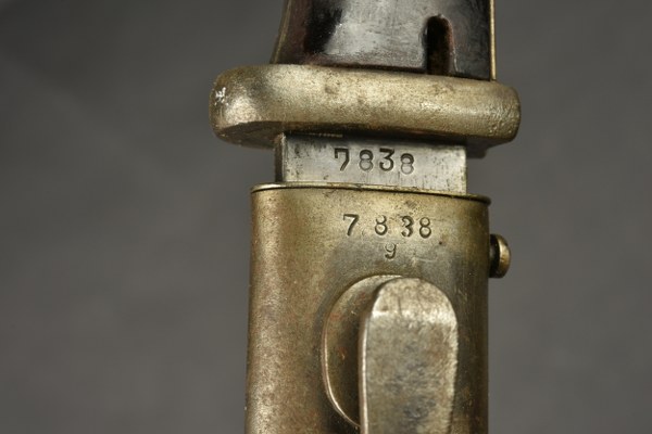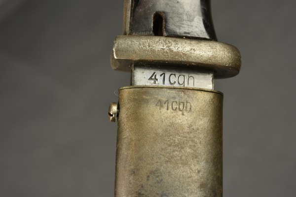 Baïonnette allemande 98K aux mêmes numéros. Lame et fourreau aux mêmes numéros, même code fabricant CQH daté 1941. Plaquettes bakelite, bouton poussoir fonctionnel. Fourreau et pommeau avec rouille superficielle, à nettoyer II+