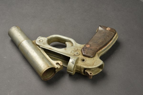 Pistolet lance fusée allemand LP42. En métal, présentant quelques traces d’oxydation. Plaquettes en bakélite marron. Marquages WA 81050. Anneau grenadière présent. Toutes les pièces mobiles sont fonctionnelles. Usure et patine. Libre d'acquisition et détention pour personne majeure. II+