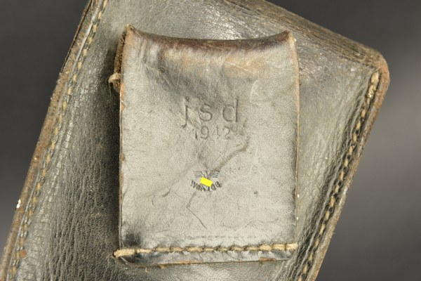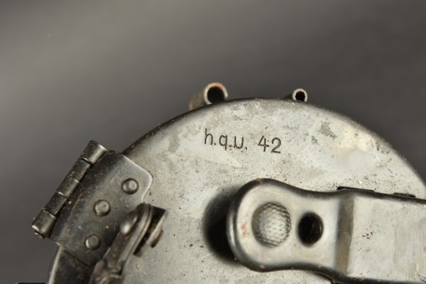 Tambour de MG34 et étui pour lance grenade allemand. Beau Trommel pour mitrailleuse MG34, avec 90% de sa peinture d'origine. Marquage sur le dessus code fabricant H.Q.U. et daté 1942. Un étui pour le lance grenade, en cuir noir. Marquage sur le passant de ceinturon code fabricant J.S.D. daté 1942 avec WaffenAmt. Sangle de portage absente. II+