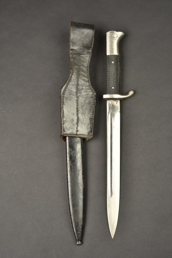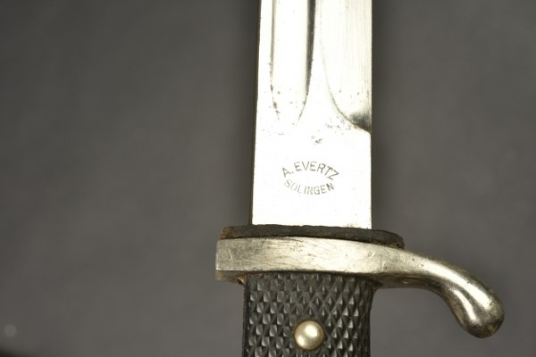 Baïonnette de sortie allemande. Belle lame du fabricant A. Evertz de Solingen. Bouton poussoir fonctionnel. Avec son fourreau. Porte fourreau en cuir marron foncé cousu, modèle non adapté, trop large. Bon état. II+