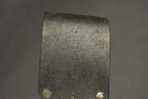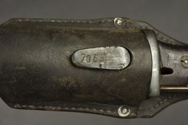 Baïonnette allemande 98K avec porte fourreau. Belle lame fabricant J. Sch. Datée 1938. Plaquettes bakelite. Fourreau pas au même numéro, bouton de chape rebrasé. Porte fourreau cuir noir d'un fabricant de Graz daté 1939, avec sa patte de maintien. A nettoyer II+