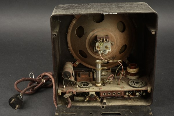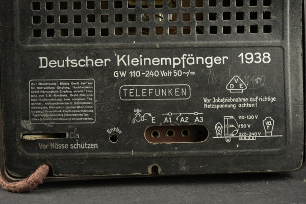 Radio du peuple allemande Kleinempfanger DKE 38. Radio allemande petit modèle, type Deutscher Kleinempfänger 1938. En bakélite marron très foncé, plaque en carton au dos marquée Deutscher Kleinmpfänger avec câble et fiche, aigle allemand sur la face avant. Manque les vis arrière. Fonctionnement non vérifié II