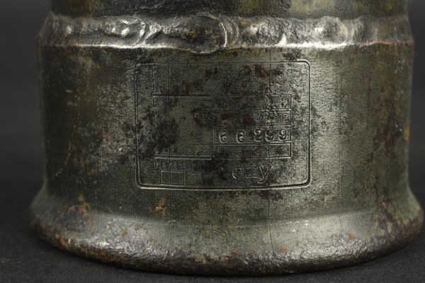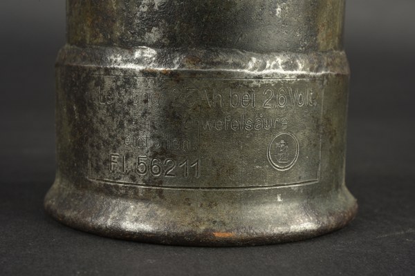 Panzerlanterne de la Luftwaffe en métal épais, avec verre complet et crochet de suspension présent. Restes de marquages visibles, dont Leistung 25 AH bei 26 Volt et code FL 56211. Code fabricant EZI. Cette panzerhandlampe était utilisée comme feu de piste d’atterrissage mobile pour la Luftwaffe et également comme source de lumière pour les réparations mécaniques sur avions, véhicules blindés et chars. Présente une certaine usure, une patine caractéristique, ainsi que des traces d’oxydation. État II+. 2+