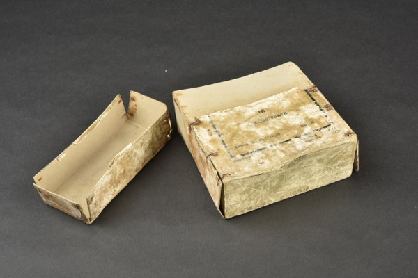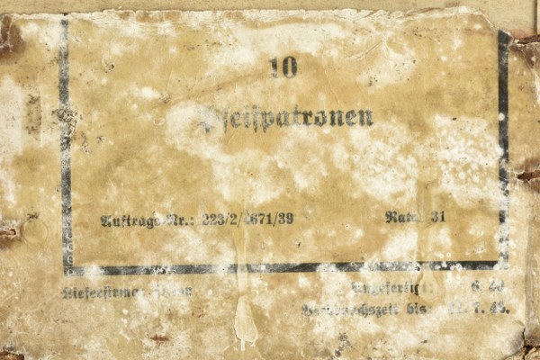 Boites pour fusées éclairantes. Belle boite, présentant des déchirures et quelques manques. Reste de marquages 10 Patronen, date illisible. A noter une certaine usure et patine de la pièce. Etat II+. 2+