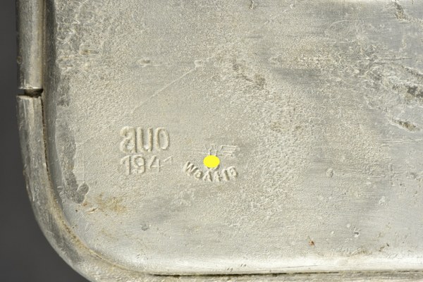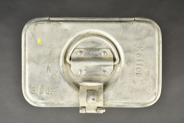Boite de Kaffee pour cuisine Roulante. Modèle en aluminium, complète avec son couvercle. La poignée de transport est présente. Fermeture fonctionnelle. Marquages Kaffee 3 K GR. Fabrication AUO 1941. Vide. A noter une certaine usure et patine de la pièce. Etat II+. 2+