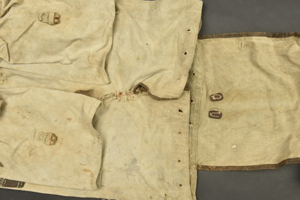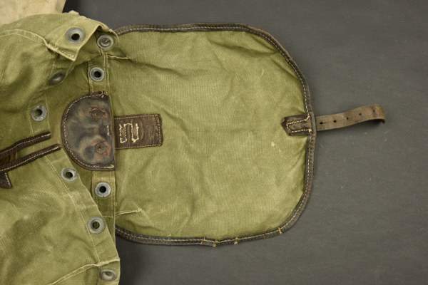 Relique de sacs allemand. Comprenant un sac à dos en toile Feldgrau, toutes les sangles sont manquantes, daté 1942. Un sac à dos en toile beige et cuir marron, incomplet. A noter une certaine usure et patine des pièces, ainsi que des tâches et accrocs. Etat II-. 2-
