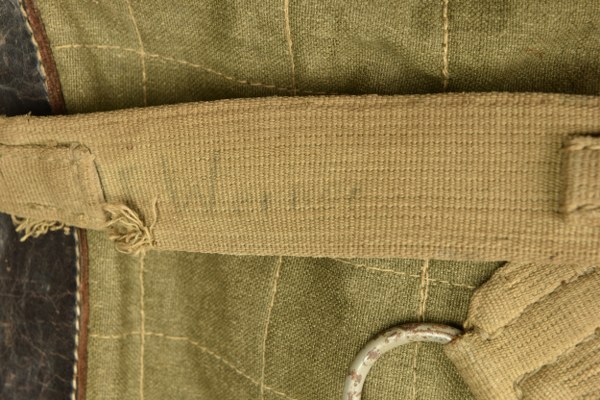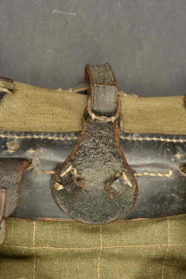 Sac à dos poils de vache. Modèle en tissu Feldgrau. La majorité des sangles sont présentes. Fabrication Lud Krummag 1941. Les bretelles sont manquantes, mais elles ont été remplacées par la partie avant d'un brelage tropicale allemand, seule la partie arrière est manquante. La patte de liaison en cuir marron est présentes. Marqugaes Bielefeld 1941. A noter une certaine usure et patine de la pièce, ainsi que quelques tâches. Etat II+. 2+