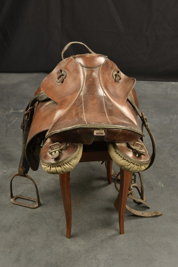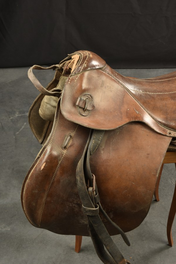 Selle allemande. En cuir. La majorité des sangles sont présentes. Un étrier présent mais complètement oxydé. Datée 1943, avec bel aigle Waa. Taille 3. A noter une certaine usure et patine de la pièce. Etat II+. 2+