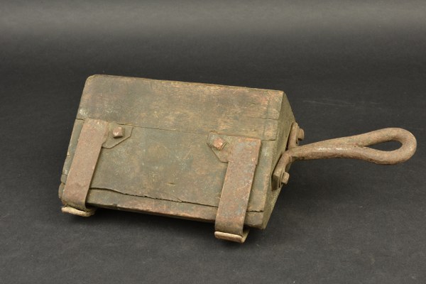 Câle allemande. Modèle pour véhicule ou avion avec de nombreux renforts en métal. Les renforts inférieurs disposent de clous d'ancrage au sol. Toutes les pièces métalliques sont oxydées. A noter une certaine usure et patine des pièces. Etat II+. 2+