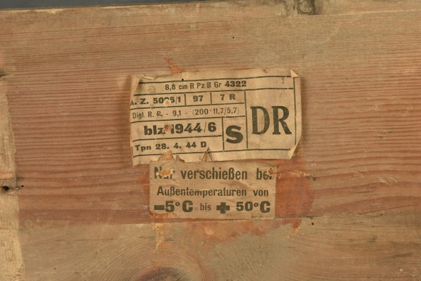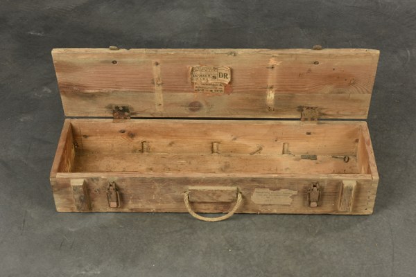 Caisse de munition de panzerschreck. En bois. Le crochets sont présents mais oxydés. La poignée de transport en cordelette est présente. Couvercle disposant d'un reste de marquage R Mun 4322 X. Etiquette de la face avant marquée Wintermunition. Etiquette interne marquée 8,8 cm R Pz B GR 4322 BLZ 1944/6. Les racks sont manquants. A noter une certaine usure et patine de la pièce. Etat II+. 2+