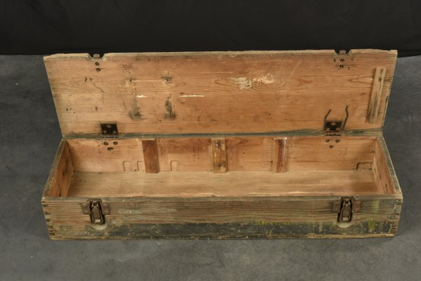 Caisse KVK 42. En bois, les cordelettes de transport sont présentes. Les crochets sont présents, mais oxydés. Couvercle marqué Patr 5 cm KWK 42. Etiquette absente, ainsi que les racks. Les marquages de la face avant sont illisibles. A noter une certaine usure et patine de la pièce. Etat II+. 2+