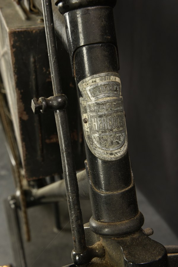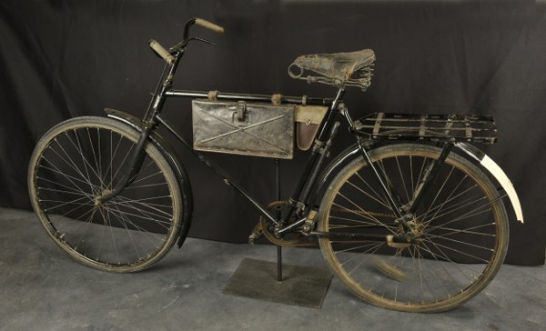 Vélo allemand. Cadre en métal, daté 1943 et numéro 634112. Peinture noire à 70%. Les gardes boue sont présents, la partie arrière dispose d'une peinture blanche. Plaque fabricant illisible. Roues à rayon. Pneus dégonflés. Les freins sont fonctionnels. Caisse à outil en métal, vide, les support sont complets mais oxydés. Petite pochette à outil en cuir, vide. Selle fortement abîmée. Pédales avec réflecteurs repeintes. Chaine complète, mais oxydée. Pompe à vélo complète. Porte bagage en métal, repeint. Les poignées ont été remplacées par des sparadraps. A noter une certaine usure et patine de la pièce. Etat II+. 2+