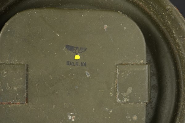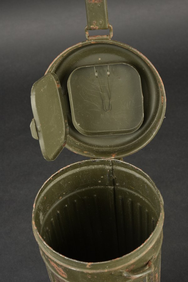 Boitier de masque anti-taz. Modèle long. En métal, peinure Feldgrau présente à 70%. Quelques bosses visibles. Tirette complète. Les autres sangles sont maquantes. Les verres de rechange sont manquants. Vide. A noter une certaine usure et patine de la pièce. Etat II+. 2+