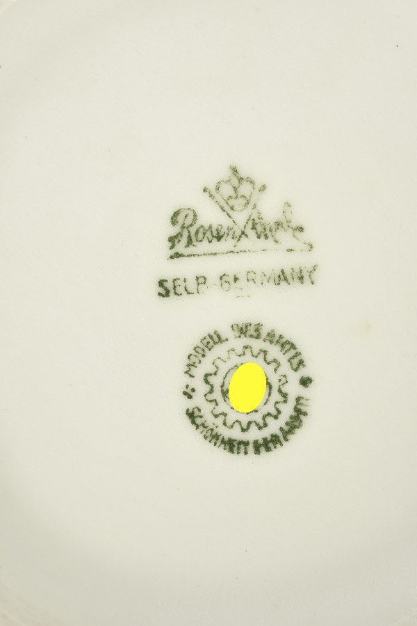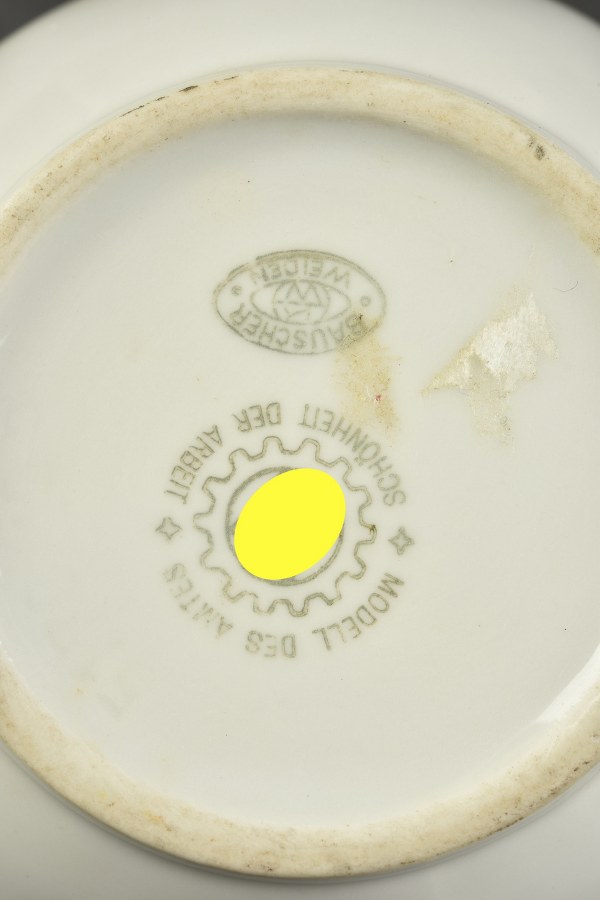 Vaisselle du DAF. Comprenant un pot en céramique blanche, bel insigne du DAF, fabrication Bauscher. Une tasse en céramique blanche, liseré vert faisant le tour de l'objet. Poignée complète, Bel insigne du DAF, fabrication Rosenthal. A noter une certaine usure et patine des pièces. Etat II+. 2+