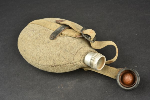 Gourde allemande. En aluminium, fabrication VDNS 42. Housse en feutrine présentant quelques trous de mite. Les boutons pressions sont fonctionnels. Quart absent. Harnais en toile complet. A noter une certaine usure et patine de la pièce. Etat II+. 2+