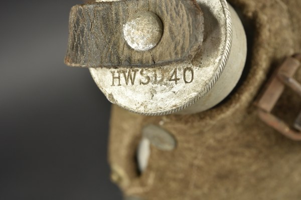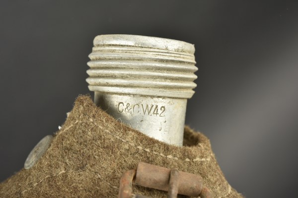 Gourde allemande. Gourde en aluminium, fabrication CCW42. Housse en feutrine présentant des traces de mite. Harnais en cuir complet, partiellement décousu. Quart en bakélite noire. A noter une certaine usure et patine de la pièce. Etat II+. 2+