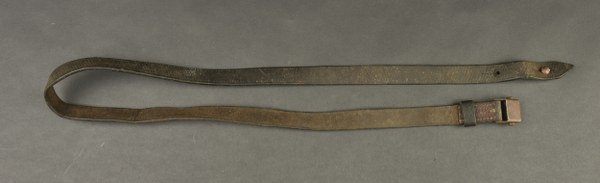 Bretelle de pistolet mitrailleur MP40. En cuir marron strié. Complète. Deux perforations de réglage. Sans marquages visibles. Les parties métalliques sont oxydées. A noter une certaine usure et patine de la pièce. Etat II+. 2+