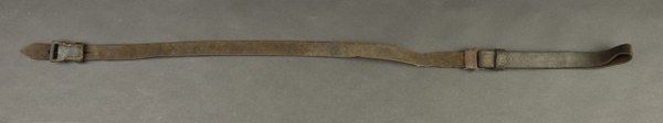 Bretelle de pistolet mitrailleur MP40. En cuir marron strié. Complète. Deux perforations de réglage. Sans marquages visibles. Les parties métalliques sont oxydées. A noter une certaine usure et patine de la pièce. Etat II+. 2+