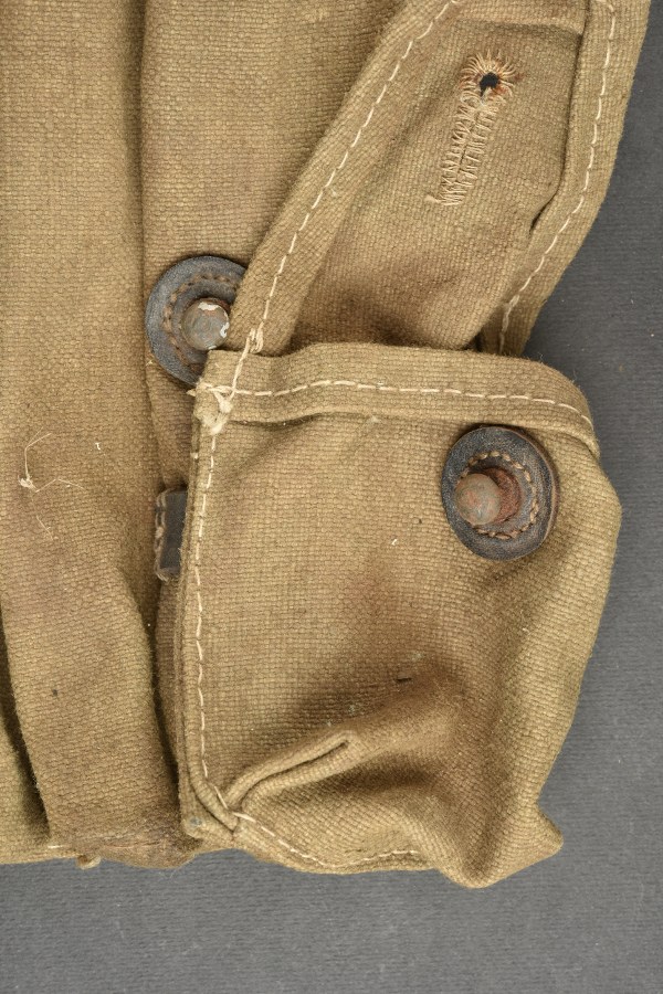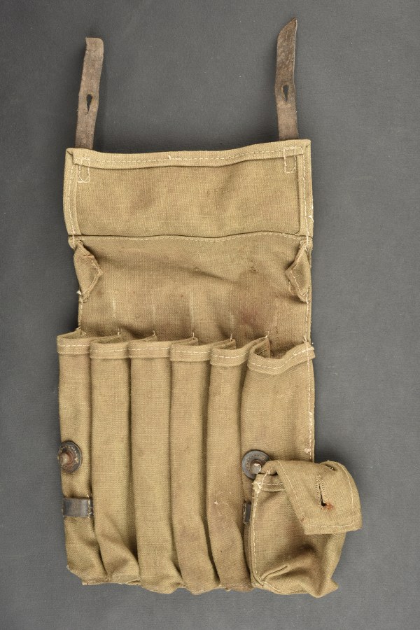 Reproduction de porte chargeur MP40. Ancienne reproduction. Six compartiments, toutes les sangles sont présentes, sauf la sangle de transport. A noter une certaine usure et patine de la pièce. Etat II+. 2+