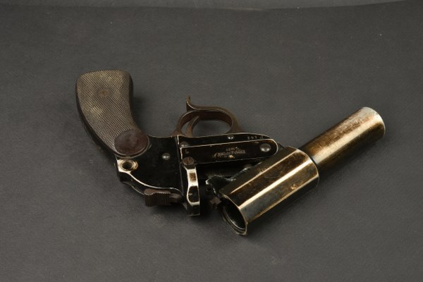 Pistolet lance fusée allemand. Modèle LP 34. En métal, couleur noire à 60%. Plaquettes en bakélite noire. Anneau grenadière complet. Toutes les pièces mobiles sont fonctionnelles. Numéro P143. Fabrication Erma Erfurt 1937. Nombreux aigles Waa. A noter une certaine usure et patine de la pièce. Etat II+. 2+