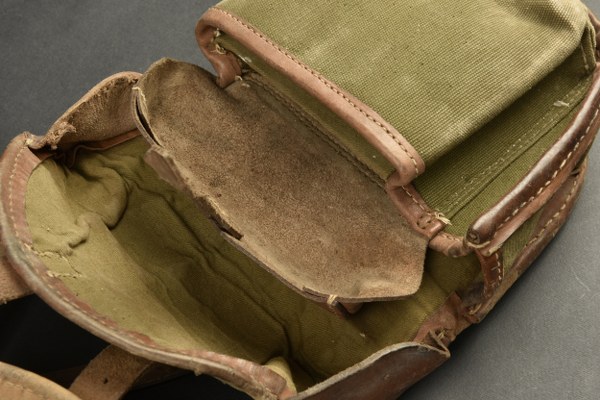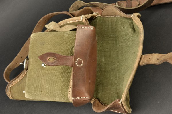 Lot de 2 sacoches pour lance fusée Pacte de Varsovie. Sacoche en toile verte et cuir fauve, avec leurs sangles de fermeture, poches à fusées, et sangles de portage. Roumanie ou autre pays de l'Est. Bon état II+