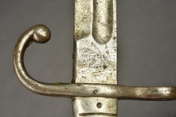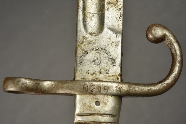 Argentine et Brésil lot de 2 baïonnettes. Baïonnette Brésilienne modèle 1908, fabrication WKC Solingen avec fourreau cuir et laiton. Une baïonnette Argentine raccourcie, sans fourreau. Oxydation, usure, à nettoyer. III