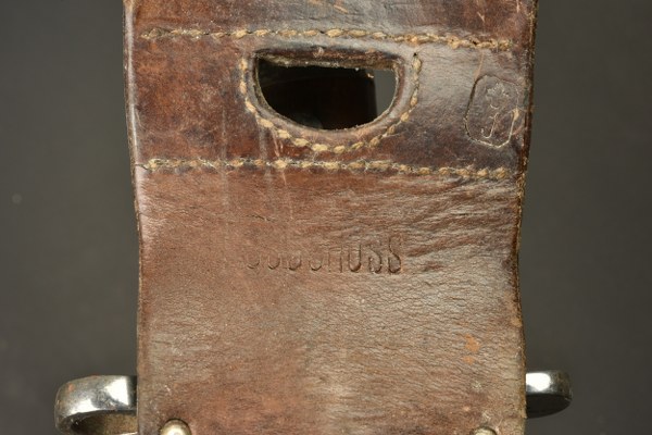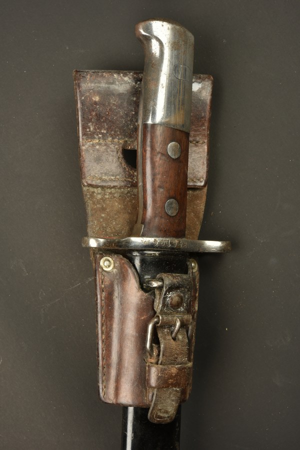 Baïonnette Suisse modèle 1914 avec porte fourreau. Belle et forte lame à dents de scie, dans sa longueur, marquée Waffenfabrik Neuhausen. Fourreau fer laqué noir avec son pontet et son sanglon. Porte fourreau cuir avec marquages fabricant et réception. Bon état, usure d'usage. II+