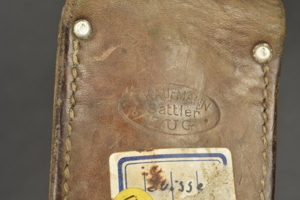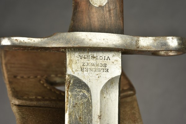 Suisse Baïonette modèle 1918 avec porte fourreau. Pour Schmidt Rubin, lame marquée Elsener Schwyz Victoria en bon état. Plaquettes bois, poussoir fonctionnel. Fourreau fer avec porte fourreau cuir. Usure et patine. II
