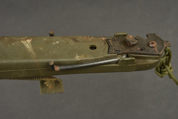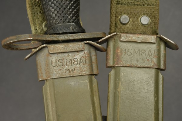 US et Allemagne lot de poignards, baïonnette et fourreaux modernes. Couteau de combat allemand, lame Bowie à dents de scie, sans fourreau. Couteau de survie multifonction avec fronde dans le fourreau, poignée creuse avec kit survie, fourreau avec système coupe barbelé. Une baïonnette US M16 avec fourreau M8A1, et 2 fourreaux M8A1 seuls dont un sans crochet. Usure, patine, à nettoyer II