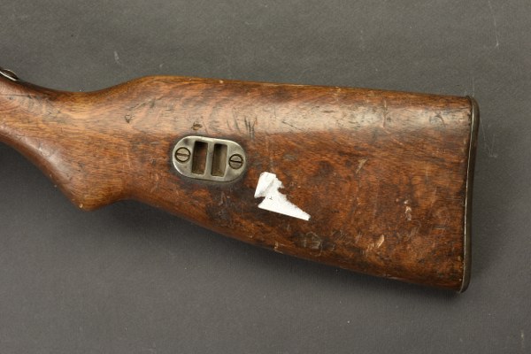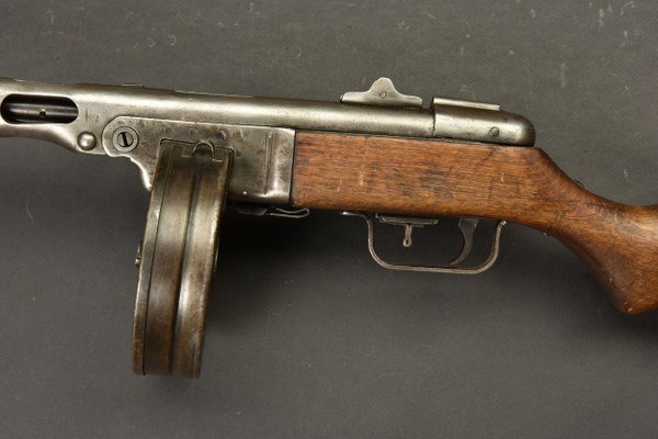 Pistolet mitrailleur PPSH 41. Le bronzage des garnitures métalliques est quasiment absent. Belle crosse en bois. Chargeur camembert, numéro 858 bloqué par la neutralisation. Culasse rendue mobile par la neutralisation +. Numéro B414, datée 1942. Catégorie C9. Arme neutralisée aux nouvelles normes européenne par le Banc d'épreuve de Saint Etienne. Cette arme doit être déclarée avec Cerfa et certificat médical de moins de 1 mois ou licence de tir tamponnée ou permis de chasse valide (art R312-56). La délivrance de l'arme n'aura lieu qu'après consultation du fichier Finadia. L'inscription de l'acheteur sur ce fichier entrainera automatiquement la nullité de la vente. A noter une certaine usure et patine de la pièce. Etat II+. 2+