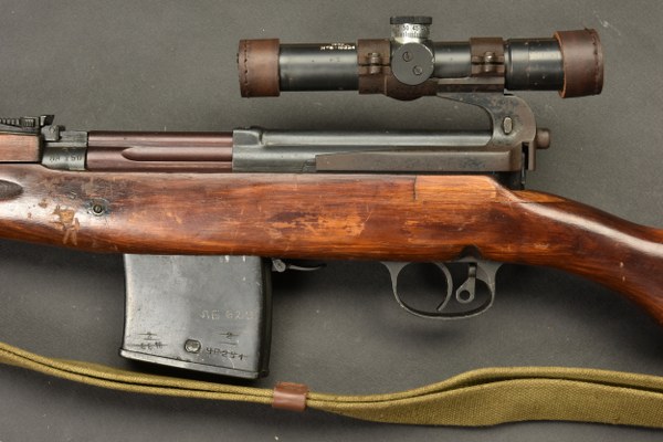 Fusil semi automatique SVT 40 Tokarev. Garnitures métalliques en couleur d'origine à 90%. Baguette de nettoyage complète. Chargeur et culasse bloqués par la neutralisation. Daté 1941. Numéro HA150. Bretelle en toile complète. Lunette complète avec ses protections en cuir marron. Marquée 1942 N6-10224. Optique claire présentant quelques tâches. Support de lunette portant le numéro HB 1548. Catégorie C9. Arme neutralisée aux nouvelles normes européenne par le Banc d'épreuve de Saint Etienne. Cette arme doit être déclarée avec Cerfa et certificat médical de moins de 1 mois ou licence de tir tamponnée ou permis de chasse valide (art R312-56). La délivrance de l'arme n'aura lieu qu'après consultation du fichier Finadia. L'inscription de l'acheteur sur ce fichier entrainera automatiquement la nullité de la vente. A noter une certaine usure et patine de la pièce. Etat II+. 2+