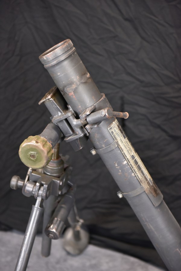 Mortier allemand Granatwerfer 34. Calibre 81 mm. Plaque de base tous azimuts, complète avec sa poignée de transport. Couleur gris-bleu à 70%. Tube lisse, d'une longueur de 114,3 cm. En métal, peinture gris/bleu à 70%, numéro 4283. Plaque de tir complète, quelques traces d'oxydation sur les bordures. Bipied complet, en métal, peinture gris/bleu à 70%. Toutes les pièces mobiles sont fonctionnelles. Marqué 4283 XC JNS ZB. Molette latéral avec reste de peinture Feldgrau, mais beaucoup plus usée que le reste de l'arme. Catégorie C9. Arme neutralisée aux nouvelles normes européenne par le Banc d'épreuve de Saint Etienne. Cette arme doit être déclarée avec Cerfa et certificat médical de moins de 1 mois ou licence de tir tamponnée ou permis de chasse valide (art R312-56). La délivrance de l'arme n'aura lieu qu'après consultation du fichier Finadia. L'inscription de l'acheteur sur ce fichier entrainera automatiquement la nullité de la vente. A noter une certaine usure et patine de la pièce. Etat II+. 2+