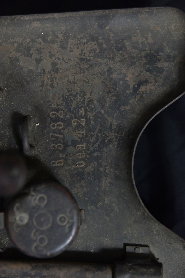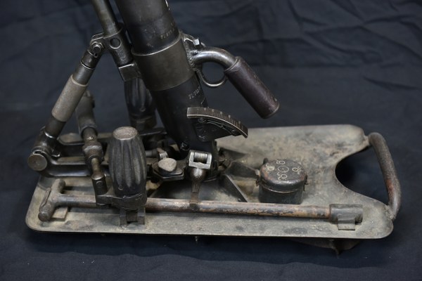 Leichtgranatwerfer 36. Calibre 50mm, numéro R3782B, fabrication Rheinmetall. Ensemble en métal dans son bronzage d'origine à 75%. Plaque de sol marquée MR B3782 BEA 42, avec aigle Waa. Reste d'un ligne d'alignement à la peinture blanche sur toute la longueur du tube. Accessoire présent au niveau du socle, ainsi que la poignée de transport. Tube en métal lisse, marqué R3782B FL 871B BEA 42, avec de nombreux aigles Waa. Poignée en bois complète. Collier marqué FL 793 42, avec de nombreux aigles Waa. Catégorie C9. Arme neutralisée aux nouvelles normes européenne par le Banc d'épreuve de Saint Etienne. Cette arme doit être déclarée avec Cerfa et certificat médical de moins de 1 mois ou licence de tir tamponnée ou permis de chasse valide (art R312-56). La délivrance de l'arme n'aura lieu qu'après consultation du fichier Finadia. L'inscription de l'acheteur sur ce fichier entrainera automatiquement la nullité de la vente. A noter une certaine usure et patine de la pièce. Etat II+. Conçu par la firme Rheinmetall-Borsig AG, le mortier léger comporte deux poignées pour être maintenu au sol, les servants étant couchés. 2+
