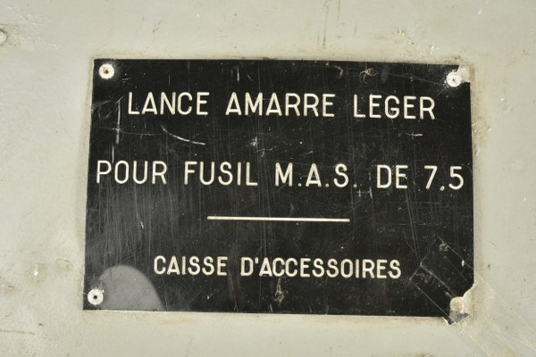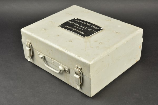 Caisse d'accessoires du lance amarre léger pour fusil français. Caisse en aluminium peint en gris avec plaque signalétique, un rivet de fixation défectureux. Poignée de transport, fermetures fonctionnelles. Contenu partiel, un projectile en bois et 2 portes pelote, vides. Usure, patine oxydation légère. Peu courant II