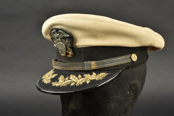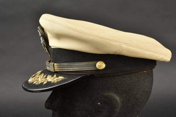 Casquette d'officier de l'US Navy. Coiffe en tissu imperméabilisé blanc. Insigne d'officier en métal. Fausse jugulaire complète. Visière recouverte d'une feutrine noire et de feuilles de chêne en cannetille or. Intérieur doublé en tissu coton. Fabrication Bancroft Military Caps. Etiquette tapée à la machine et marquée CDR Edmund M Brown MIchigan. Bandeau de sudation en cuir partiellement déchiré. A noter une certaine usure et patine de la pièce, ainsi que des tâches. Etat II+. 2+