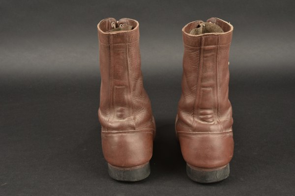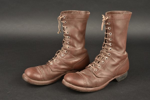 Bottes de saut de parachutiste US. Paire homogène en cuir. Bouts rapportés. L'ensemble du cuir est recouvert d'un épais cirage couleur brun rouge. La couleur d'origine semble être noire. Douze œillets de laçage. Les lacets sont postérieurs. Talons biseautés. Semelles en cuir. Fabrication Corcoran. Restes de marquages nominatif illisibles. A noter une certaine usure et patine des pièces, ainsi que des craquelures. Etat II+. 2+